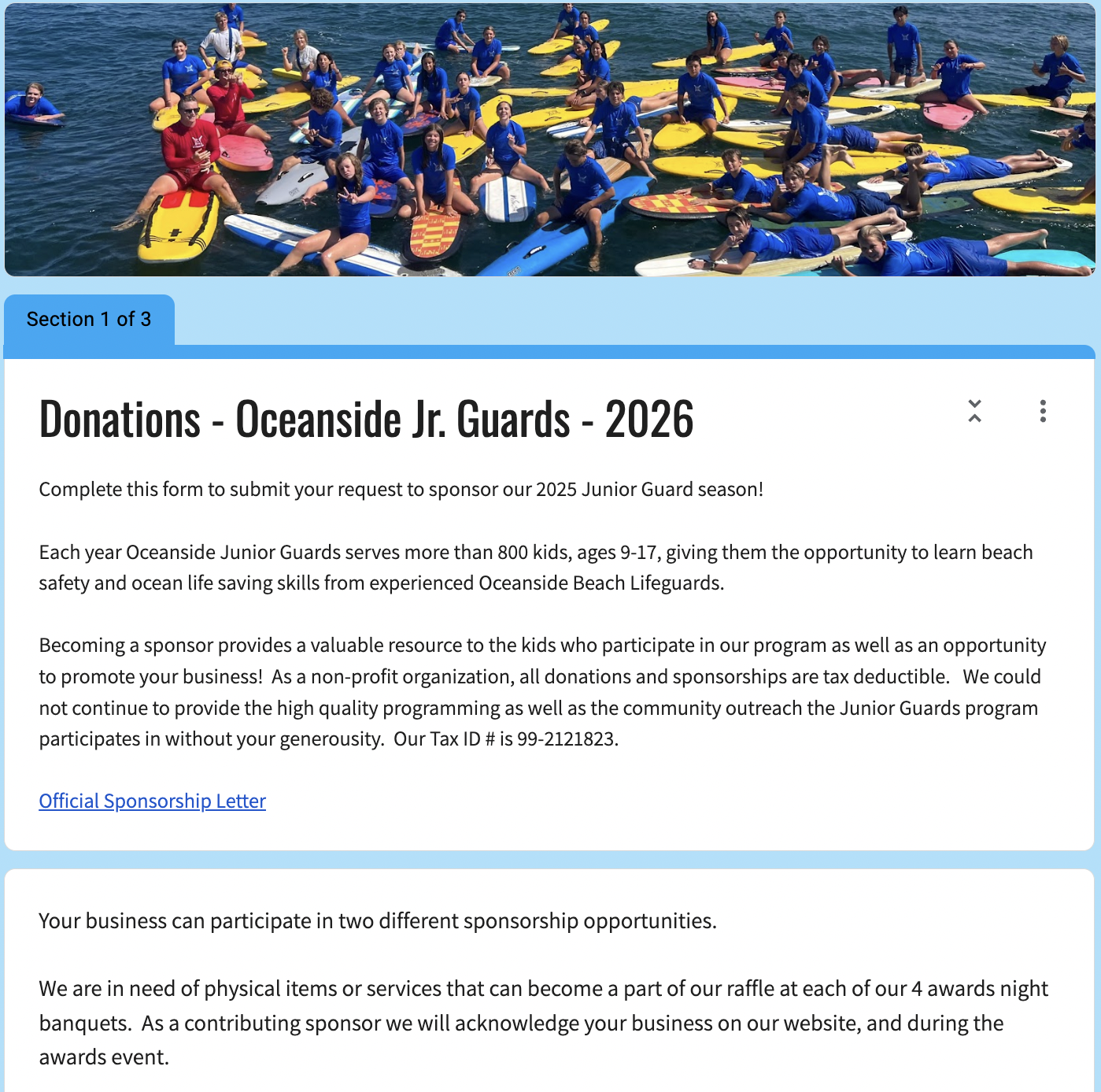 Donate $10.00 $25.00 $250.00 To be added to this seasons T-Shirt! Please also complete the google form by May 15, 2026 Custom Amount Please enter an amount $ One-Time Donation Monthly Donation Quarterly Donation Annual Donation Support us by covering the fees we have to pay 3% Cover the Fee Donate Donate Learn More About Where Donations Go and How to Support Oceanside Jr. Guards this Season